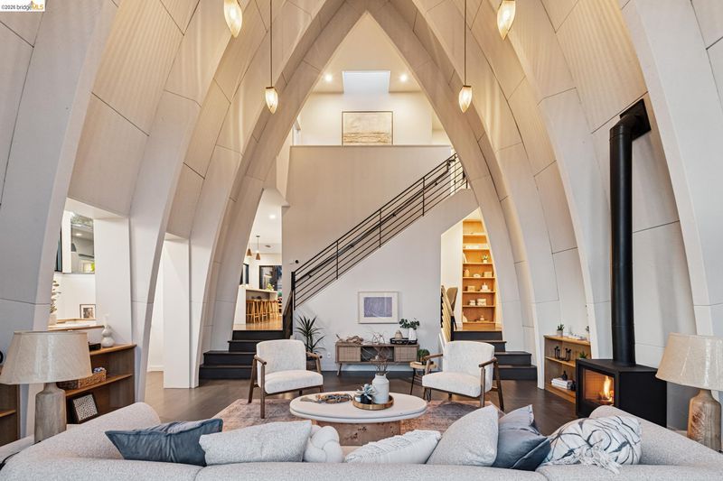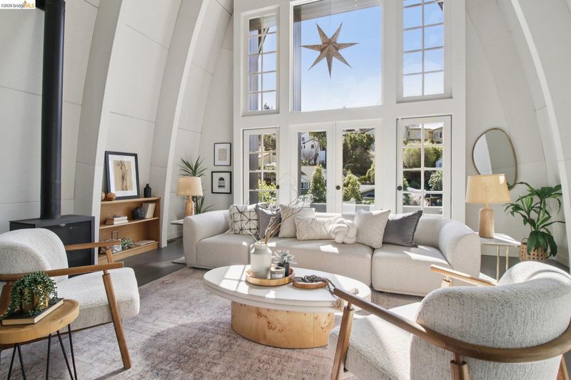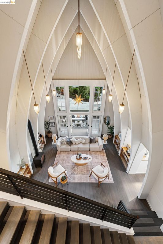 One of Rockridge’s most architecturally distinctive homes, Dragon House was originally designed by Ace Architects for Parent’s Press publisher Dixie Jordan. Inspired by Maybeck’s iconic Hearst Hall (lost to fire in 1922), its dramatic 22-foot vaulted ceilings and copper-shingled roof made it an instant neighborhood landmark when completed in 1994. Beautifully reimagined by Sogno Design Group, the home balances sculptural drama with everyday comfort. The breathtaking living room opens to a sun-drenched front deck with neighborhood and Golden Gate / Bay views. A few steps up, the beautifully appointed bespoke chef’s kitchen anchors the home, while the dining area spills effortlessly to a lush level backyard - complete with putting green - an entertainer’s dream for indoor-outdoor living. Two bedrooms and a full bath finish the main level. Upstairs, a generous office with private Bay view deck complements a tranquil primary suite overlooking the garden with another Bay view deck. Prime location minutes to College Ave, Rockridge BART, and Hwys 13 & 24. Zoned for top-rated Hillcrest (TK–8). Rare. Iconic. Unmistakably Rockridge.