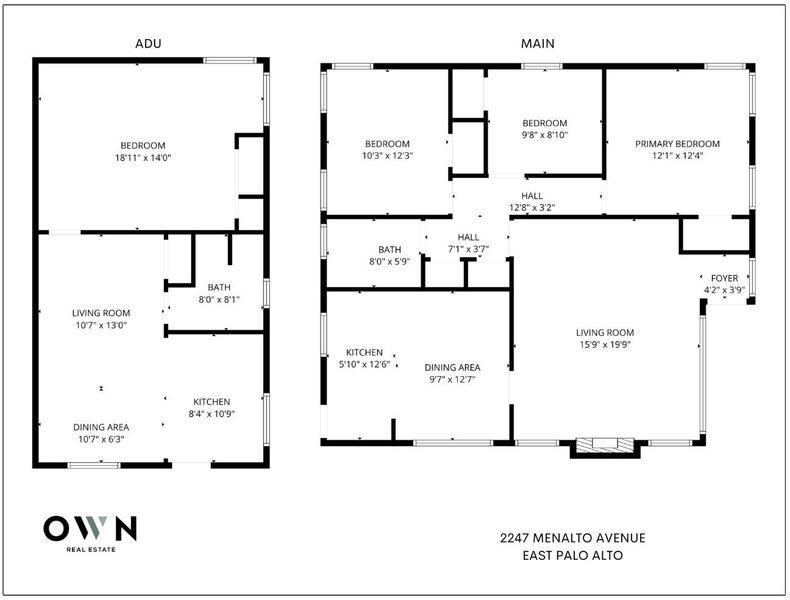 Welcome to 2247 Menalto Ave,a well-maintained & versatile property offering comfortable living, abundant natural light, & exceptional flexibility in the heart of East Palo Alto.Set on a generous 6,500 sq ft lot, this 3-bd, 1-ba home offers approx 1,100 sq ft of living space, plus a fully self-contained rear unitideal for extended family, guests, or flexible living needs. Main home feat a bright living room w/ a cozy fireplace, flowing seamlessly into the kitchen & bedroom wing. Kitchen offers ample cabinetry, generous counter space, vinyl flooring, a new faucet, & a dedicated dining area filled w/ natural light. The updated bathroom incl a shower-over-tub, new vanity sink, & new exhaust fan. 3 spacious beds provide great natural light & closet space, while hardwood flooring throughout adds timeless character.The expansive backyard offers plenty of room for entertaining, relaxing, or outdoor dining, w/ a sectioned turf area ideal for pets or play. Private rear living space incl an open kitchen w/ modern cabinetry, stone countertops, range, refrigerator, & large sink,along w/ a combined living/dining area, recessed lighting, luxury laminate flooring, spacious bedroom, & a full bathroom w/ stall shower. Fresh int & ext paint complete this inviting & flexible East Palo Alto property.