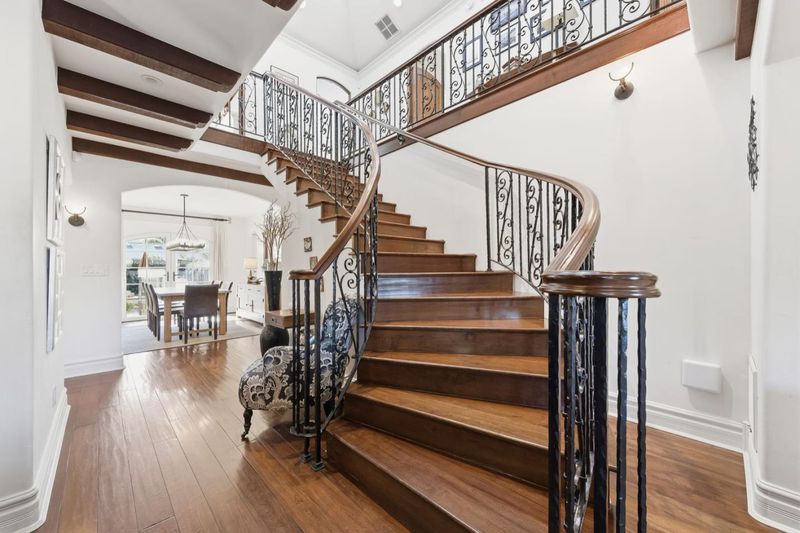 Magnificent Mediterranean masterpiece on one of San Carlos' most desirable tree-lined streets! This stunning custom home blends old-world elegance with modern luxury. Exceptional craftsmanship is showcased through French-imported roof tiles, Napa Valley stone accents, copper gutters, and hand-troweled plaster walls. The dramatic entry features a sweeping spiral staircase with custom wrought iron railing and exposed aged wood beams. The elegant living room offers marble-accented built-ins and a gorgeous stone fireplace. The remodeled chef's kitchen dazzles with top-tier appliances, pot-filler, and abundant cabinetry, opening seamlessly to the dining area and lush backyard ideal for entertaining. The luxurious primary suite includes dual custom closets, a private terrace, and a spa-inspired bath with clawfoot tub, large shower, heated floors, and quartz counters. Enjoy cherry hardwood floors, Sonos sound, dual-zone HVAC, skylights, and a spectacular backyard oasis with pool, spa, waterfall, flagstone patio, and built-in BBQ. Just blocks to downtown, top-rated schools, and commute routes. This extraordinary home defines the best of San Carlos living!
