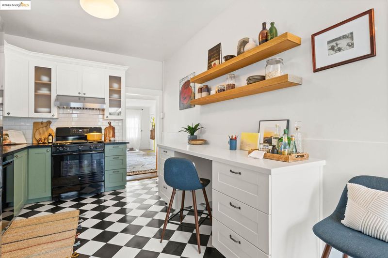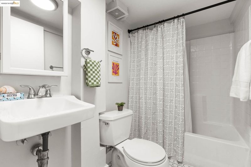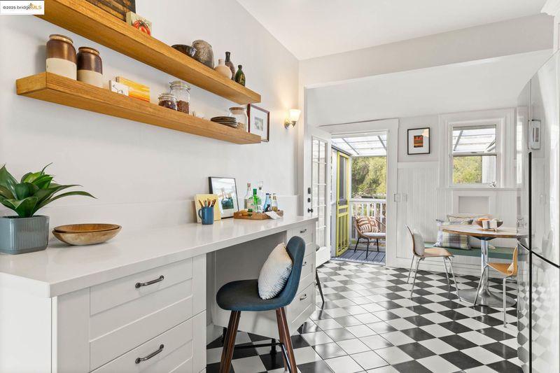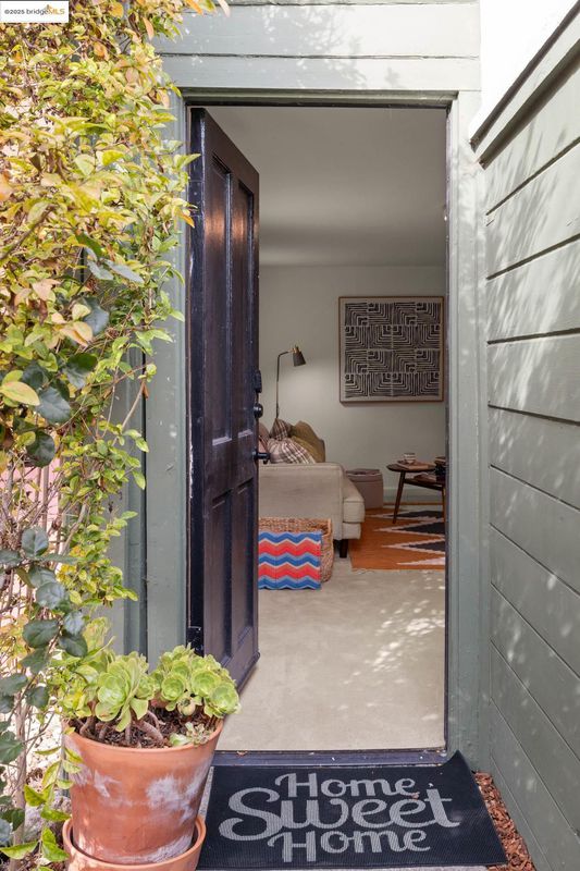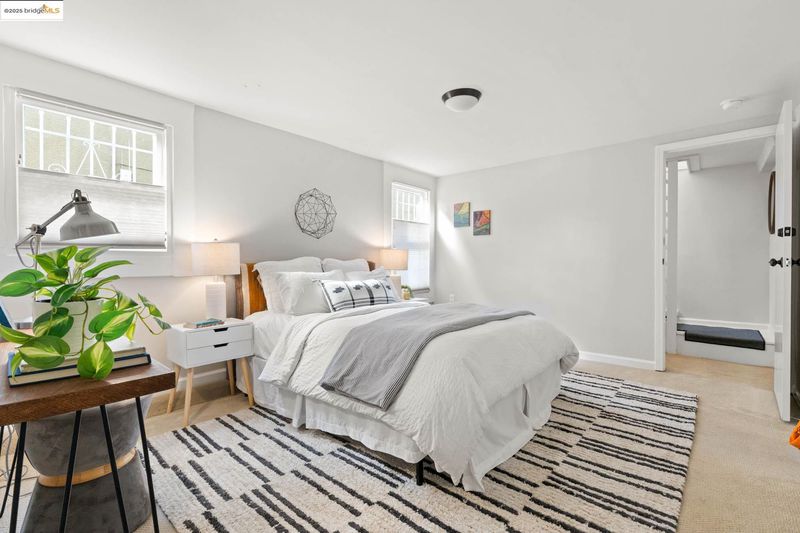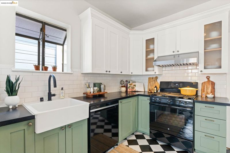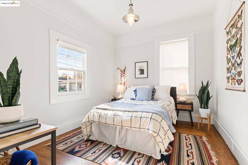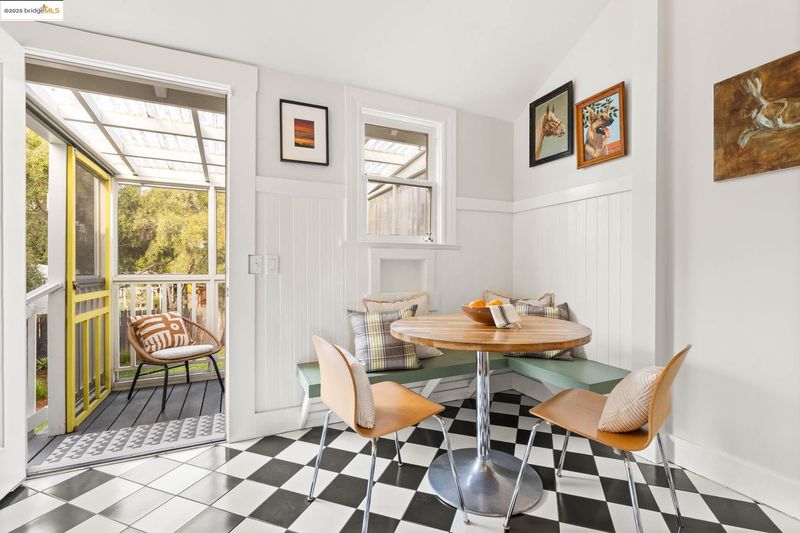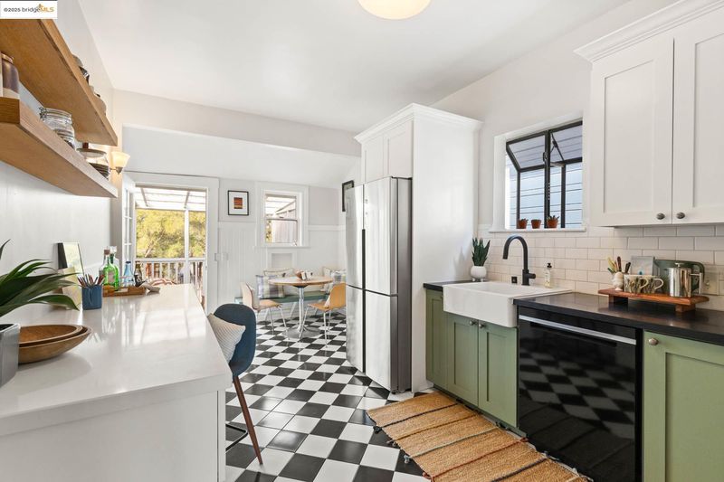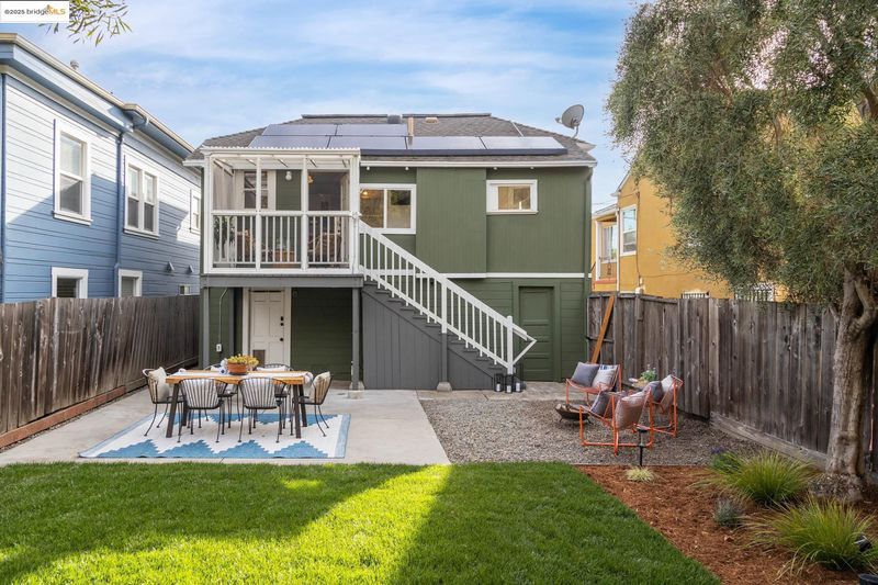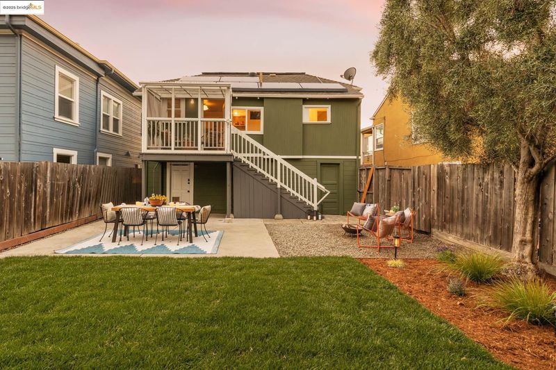 Welcome to 954 46th Street, a beautifully updated California bungalow blending timeless charm with modern style. The rich green façade with crisp white trim and lush, mature landscaping sets the tone. Inside, sunlight fills the oversized living area, highlighting beautiful wood floors. Two spacious bedrooms boast tall ceilings and plenty of windows! Conveniently located, the gorgeously remodeled bath features Pottery Barn vanity, Fireclay tile and Brizo faucet. The kitchen impresses with green and white cabinetry, stone counters, checkerboard floors, built-in desk, and eat-in area that opens to the backyard. Enjoy a screened-in deck, flat yard with large grassy lawn, and patio for outdoor dining and entertaining. The finished lower level offers multiple spaces that can be used for guests, media room, office, gym. Downstairs, you will also find a bath and kitchenette. Attached garage with interior access. Modern touches include solar panels, Nest system, Tesla car charger, on-demand water heater. Sidewalk & sewer compliant! Prime location near Lower Rockridge, Temescal, and Emeryville—close to dining, shops, and BART, commuting options. Temescal Community Garden is one block away. With a Bikescore® of 99 and a Walkscore® of 89, what a wonderful place to call home.