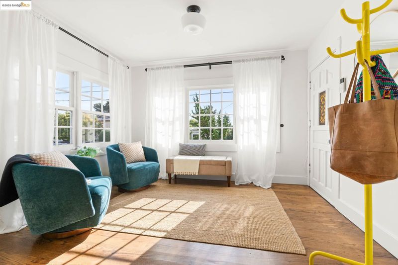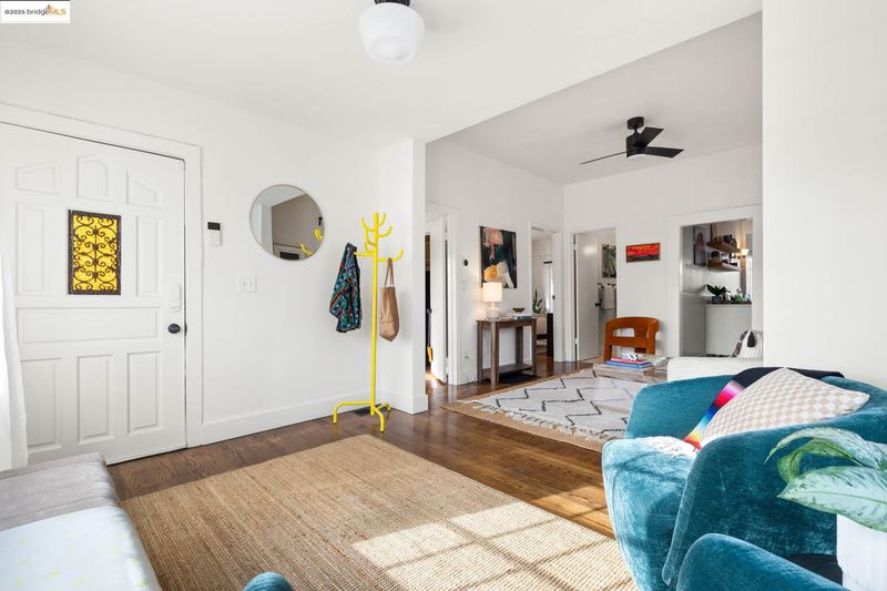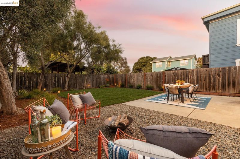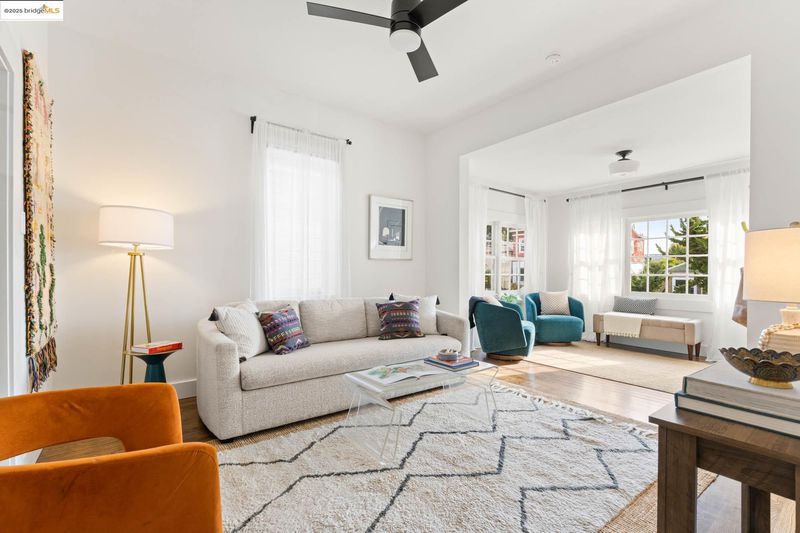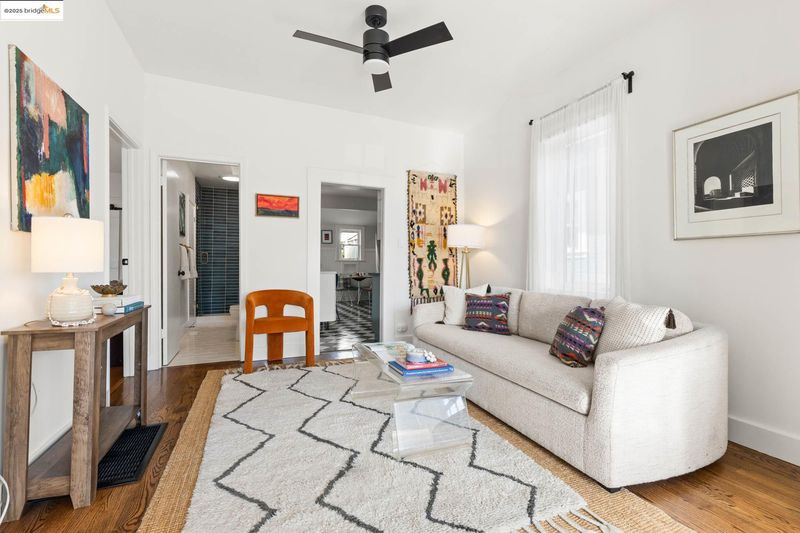 Charming and modern Craftsman with soaring ceilings, lots of windows, hardwood floors, updated eat-in kitchen and bath. Finished downstairs w/ multiple flexible spaces including kitchenette and bath. Large, flat and grassy backyard. Attached garage. Solar, EV charger, on-demand water heater. Sewer, sidewalk compliant! Temescal Garden just a block away.