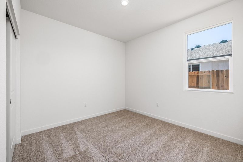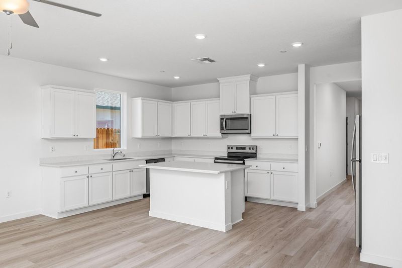 Welcome home to the Carmel floor plan, a beautifully designed single-story home located in the desirable Dantoni Ranch community. With three spacious bedrooms, two full bathrooms, and a wide-open layout, this home is perfect for families of all sizes and lifestyles. At the heart of the home, the chef-ready kitchen is a true standout. Thoughtfully designed for both everyday living and entertaining, it features stunning wood cabinets with crown molding, sleek granite countertops, a large center island for extra prep space, and a full suite of energy-efficient Whirlpool® appliances including a refrigerator and built-in microwave. The open-concept layout flows seamlessly from the kitchen into the dining and family areas, creating a warm and inviting atmosphere for gathering and making memories. The private owner's suite is a peaceful retreat, offering a large window, a walk-in closet, and a spacious en-suite bathroom with a step-in shower and generous vanity. This home includes exceptional upgrades such as double-pane Low-E vinyl windows, a programmable thermostat, a Wi-Fi-enabled garage door opener, and more all at a price you'll love.