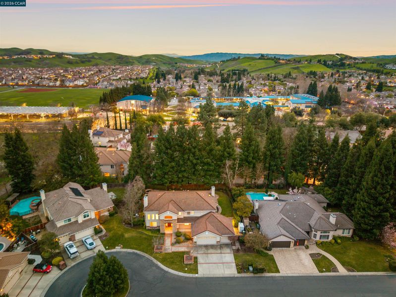 Perfectly located in the heart of Blackhawk, served by highly acclaimed schools, this expansive 5 bed, 3 bath, 3 car garage sits on a 15,000 sqft lot tucked away on a private cul-de-sac. Stone accented entry welcomes you to a dramatic 2 story foyer leading to a living room filled w/natural light, soaring ceilings, clerestory windows, & elegant fireplace. Formal dining flows to a renovated kitchen, complete w/sleek counters, abundant cabinetry, SS GE Monogram appliances & high performance gas cooktop. The kitchen overlooks the spacious family rm offering cozy fireplace & access to the backyard. The thoughtful floor plan includes a main-floor bed & bath. Upstairs, retreat to the Primary Suite, physically separated for ultimate privacy, featuring a spa-like ensuite w/soaking tub, tiled shower w/frameless glass & dual sinks. 3 additional bedrooms share a skylit bath w/dual sinks, separate tub/shower. Outside, the retreat-style backyard w/winding stone-lined concrete paths lead through multiple entertaining areas - all framed by majestic Redwood trees creating exceptional privacy. This home offers more than beautiful living spaces — it offers a place to gather.