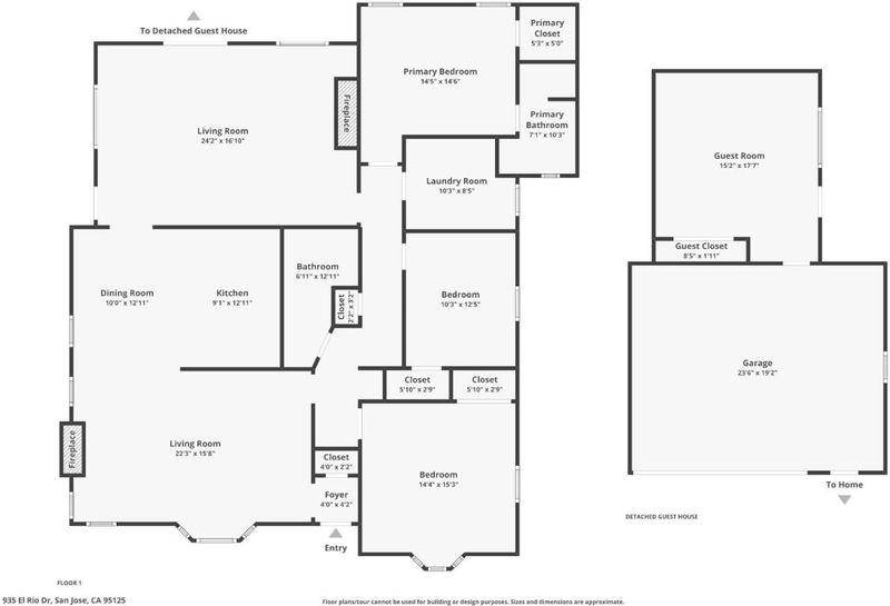 Nestled in the heart of Willow Glen, this beautifully updated 4-bedroom, 2-bath home offers generous room sizes throughout and an exceptional floor plan designed for both comfort and entertaining. The updated kitchen is filled with natural light from a charming skylight, blending style and functionality for everyday living. Enjoy both a formal living room with a bay window and cozy fireplace and an expansive family room with a second fireplace, abundant natural light, and plenty of space to gather. The primary suite features a large ensuite bath and a walk-in closet, creating a true retreat. Rich hardwood floors add warmth and character. Step outside to a large lot complete with mature fruit trees and a welcoming patio perfect for outdoor dining and relaxation. A separate detached structure offers ideal flexibility as a home office, gym, or creative studio. This is a rare opportunity to enjoy spacious living, timeless charm, and modern updates in one of the most sought-after San Jose neighborhoods.