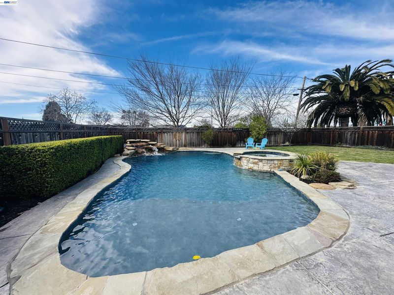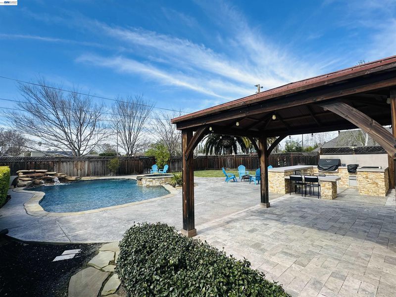 Wine Country dream home awaits! Built in 2015, this beautifully designed residence offers modern sophistication and comfortable living throughout. A stunning paver stone driveway welcomes you, setting the tone for the elegance inside. Step onto beautiful hardwood flooring that flows throughout the entire home, complemented by soaring ceilings and a unique open-concept floor plan, perfect for everyday living and entertaining. The expansive family room features custom built-in shelving and cabinetry along with a striking gas fireplace that creates a warm, inviting focal point. A downstairs bedroom and a full bathroom provides ideal space for guests or multigenerational living. Enjoy the wine station adding the perfect Wine Country touch. The chef’s kitchen is designed to impress with a large island, walk-in pantry, Thermador refrigerator, six-burner gas range, and double ovens, perfect for preparing meals and hosting gatherings. Upstairs you’ll find a spacious laundry room, office room, two large secondary bedrooms, and a luxurious primary retreat with an oversized walk-in closet and spa-inspired bathroom. The backyard is a true oasis with large pool, waterfall, hot tub, covered patio and a large U-shaped outdoor kitchen. Live your best life in this home incredible home!