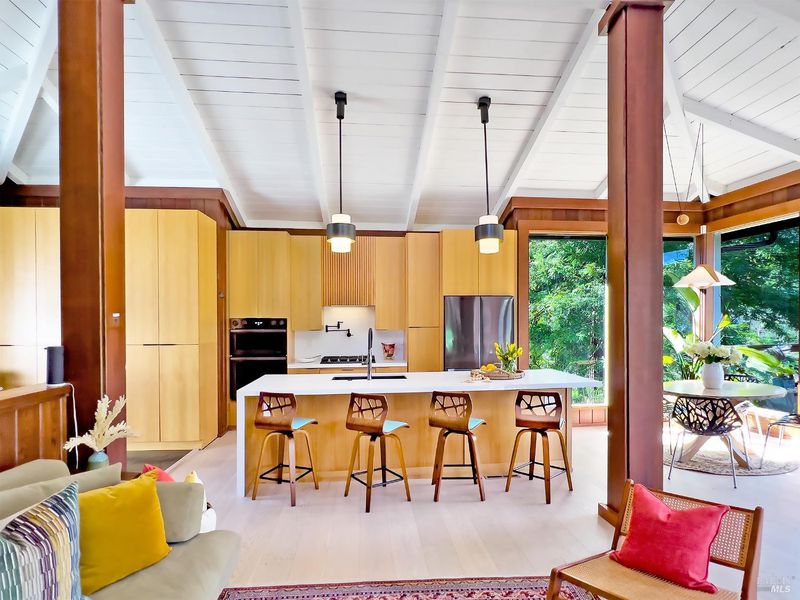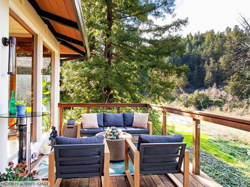 Simple Elegance. Purposely Designed. This tri-level, mid-century home with stunning panoramic water views has been renewed and refinished on every level. Personal living spaces include full baths and sleeping rooms on each floor along with a wet bar, spirits refrigerator and wine cellar below. Kitchen and Living Room face the river with a wall of tall, wide windows and unspoiled vistas. Original, raised rock fireplace graces the living room from floor to ceiling. Sweeping, manicured backyard offers easy kayak and water access, as well as Duck, Osprey and Otter watching. Backyard pomegranate, maple and avocado trees. Come and play. With picturesque downtown Guerneville so close, you'll never want to leave us.