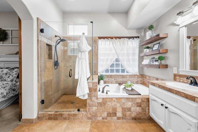 - Double Sinks, Shower Stall(s), Tub, Walk-In Closet, Window