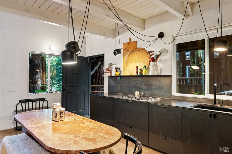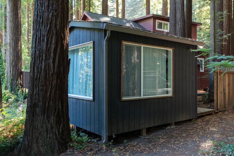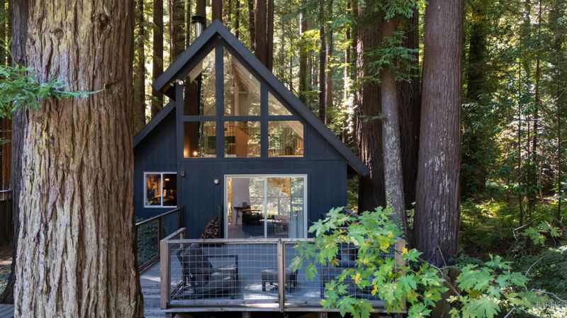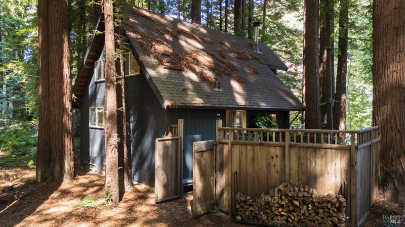 Step inside the Caz Cabin located on Austin Creek and surrounded by redwoods. Thoughtfully redesigned by Studio PLOW, the A-Frame features an open floor plan with soaring ceilings,abundant natural lightand a dramatic floor to ceiling fireplace. The very custom kitchen includes Valchromat cabinetry, sleek black steel countertops and premium appliances. Two first floor bdrms one ensuite and a hall bath. The upstairs spacious loft has views. Detached 10' X 12' studio has a Murphy Bed, and provides space for an office or studio. Thgis property has been a successful vacation rental. Can sleep up to 10. The decks are spacious and compliment the views of Austin Creek, which is directly behind the house. Featured in Dwell Magazine and the New York Times Real Estate section this is a very special one of a kind retreat, vacation home or investment property.