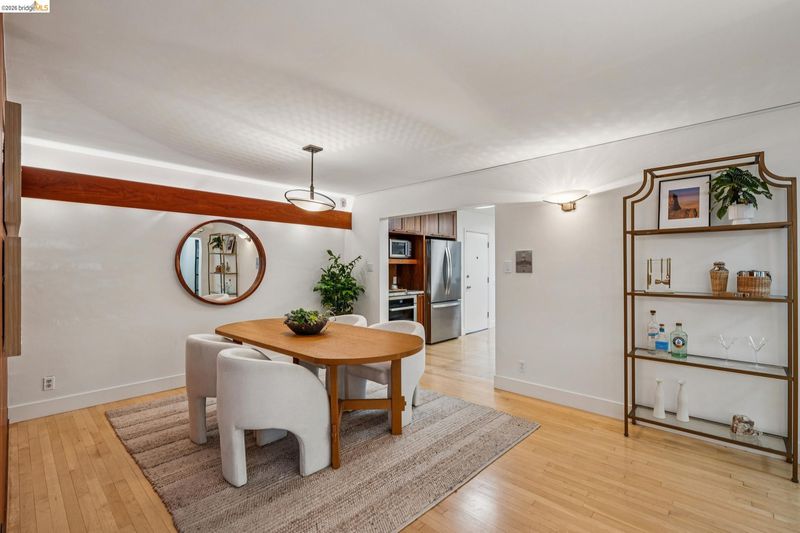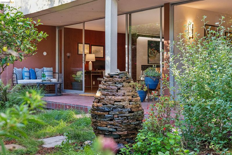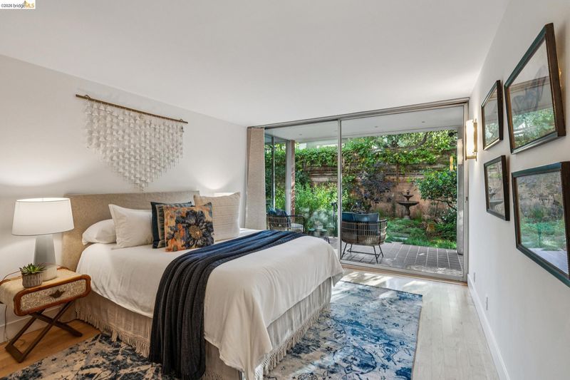Experience luxurious, all-level living in one of Berkeley's most coveted locations. This expansive Mid-century residence offers a sophisticated retreat in the heart of walkable North Berkeley, just steps from the famed Gourmet Ghetto. As one of only two units with a private garden, it is professionally landscaped featuring two soothing water features and offers a truly serene environment. Situated on the quiet, garden-facing side of a rare elevator building, this unit has two spacious bedrooms—including a primary suite—and two bathrooms. The home is anchored by an exceptional eat-in kitchen featuring exquisite cabinetry, stone counters, intricate tile work and high-end appliances. This culinary heart opens to a spacious dining area with cove lighting and a living room with original wood built-ins, all featuring floor-to-ceiling doors that invite natural light and provide access to a private lush garden and patio spaces. Two beautifully remodeled baths with artisan tile and incredible finishes and fixtures. Maple flooring is installed throughout the unit as are unique Hubbardton Forge lighting elevating the spaces. Additional amenities include two gated garage spots, a large storage unit, a community room and a roof-level event space with spectactcular SFbay views! BESO Exempt.