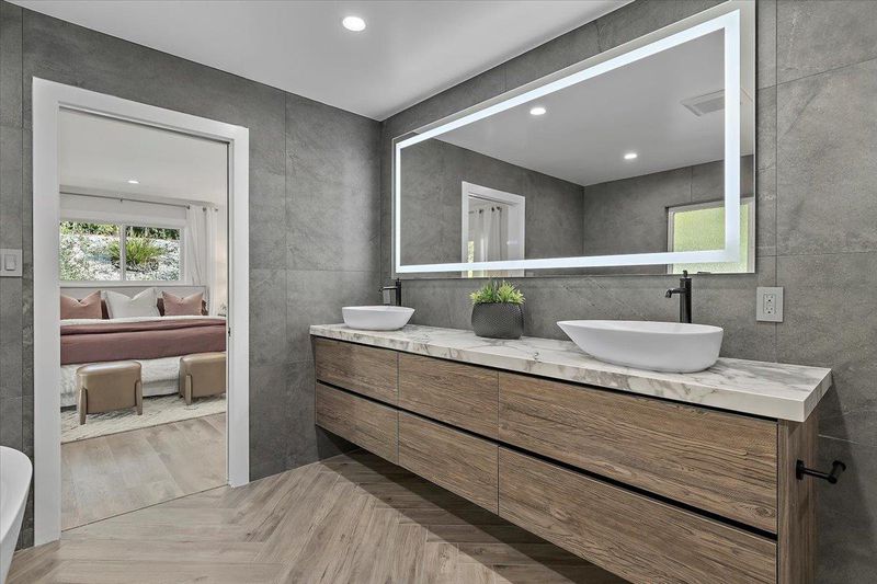 - Bidet, Double Sinks, Stall Shower, Skylight, Tile, Tub in Primary Bedroom, Updated Bath, Oversized Tub