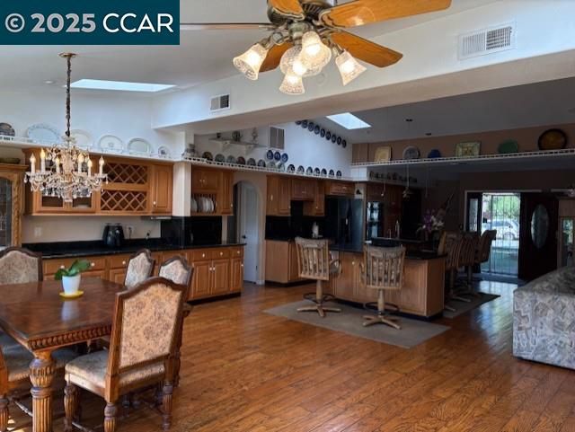 - Dishwasher, Electric Range, Microwave, Oven, Refrigerator, Trash Compactor, Dryer, Washer, Electric Water Heater, 220 Volt Outlet, Eat-in Kitchen, Electric Range/Cooktop, Disposal, Kitchen Island, Oven Built-in, Skylight(s), Updated Kitchen